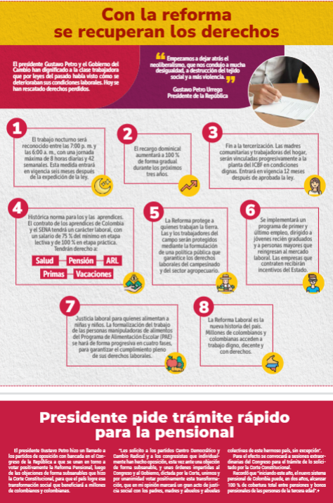 Luego de la sanción de la Ley Laboral, en la Quinta de Bolívar de Bogotá, el presidente Gustavo Petro aseguró que “la forma de hacer cumplir esta ley es que haya organización entre los trabajadores y las trabajadoras’ y es desde este momento en que empieza “una fase de organización de la clase trabajadora de Colombia’.