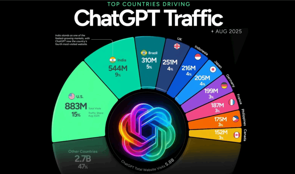 DeepSeek cayó más del 50% desde inicios del año. Regionalmente, EE.UU, India y Brasil lideran la adopción, Europa muestra preferencia por herramientas seguras, y China continúa dominada por plataformas locales.